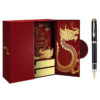 Hộp quà bút ký chủ đề Kinh thành Huế có thiết kế cánh bướm với gam màu đỏ thẫm tượng trưng cho may mắn, được trang trí bằng các chi tiết vàng tỉ mỉ. Họa tiết rồng và Kinh thành Huế tạo nên nghệ thuật mang đậm giá trị văn hóa, thể hiện rõ chủ đề “Hào Khí Cố Đô”.