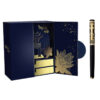 Hộp quà bút ký TLHN019 lấy màu xanh đậm làm chủ đạo cùng hoạ tiết gợn sóng trên bề mặt tạo cảm giác thanh nhã và hài hoà, .Ở trung tâm là hình ảnh của Khuê Văn Các biểu tượng kiến trúc truyền thống nổi tiếng tại Văn Miếu – Quốc Tử Giám, gợi lên nét văn hóa và lịch sử lâu đời của Việt Nam. Bên trong hộp, hoa văn nổi bật với hình ảnh Khuê Văn Các và hoa sen vàng – biểu tượng quốc hoa của Việt Nam, đại diện cho sự thuần khiết, cao quý và niềm tự hào dân tộc.