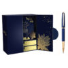 Hộp quà bút ký TLHN021 lấy màu xanh đậm làm chủ đạo cùng hoạ tiết gợn sóng trên bề mặt tạo cảm giác thanh nhã và hài hoà, .Ở trung tâm là hình ảnh của Khuê Văn Các biểu tượng kiến trúc truyền thống nổi tiếng tại Văn Miếu – Quốc Tử Giám, gợi lên nét văn hóa và lịch sử lâu đời của Việt Nam. Bên trong hộp, hoa văn nổi bật với hình ảnh Khuê Văn Các và hoa sen vàng – biểu tượng quốc hoa của Việt Nam, đại diện cho sự thuần khiết, cao quý và niềm tự hào dân tộc.