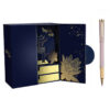Hộp quà bút ký TLHN037 lấy màu xanh đậm làm chủ đạo cùng hoạ tiết gợn sóng trên bề mặt tạo cảm giác thanh nhã và hài hoà, .Ở trung tâm là hình ảnh của Khuê Văn Các biểu tượng kiến trúc truyền thống nổi tiếng tại Văn Miếu – Quốc Tử Giám, gợi lên nét văn hóa và lịch sử lâu đời của Việt Nam. Bên trong hộp, hoa văn nổi bật với hình ảnh Khuê Văn Các và hoa sen vàng – biểu tượng quốc hoa của Việt Nam, đại diện cho sự thuần khiết, cao quý và niềm tự hào dân tộc.