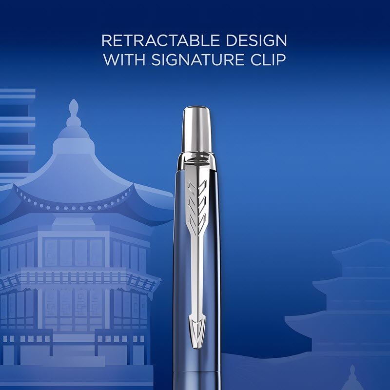 Mặt thân bút được khắc hoặc xuyên họa tiết biểu tượng kiến trúc hoặc đường nét thành phố Seoul – một chi tiết tinh tế tạo nên sự khác biệt so với các bản Jotter chuẩn. Clip hình mũi tên ký hiệu Parker vẫn hiện diện như một dấu ấn nhận diện thương hiệu. Tổng thể mang phong cách hiện đại nhưng vẫn giữ được nét cổ điển sang trọng.